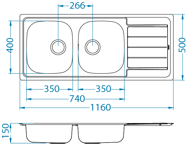 LINE 100 NAT Standard 116x50 2k zlew wpuszczany z odpływem zatyczkowym fi114 z syfonem