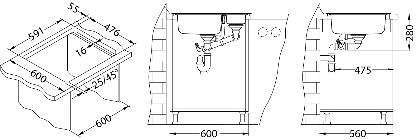 LINE 50 LEN Standard 61,5x50 1 1/2K zlew wpuszczany z odpływem zatyczkowym fi114 z syfonem