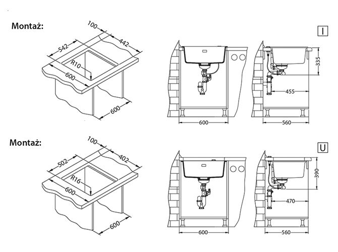 Wybór spośród 2 sposobów montażu - możliwość montażu w klasyczny wpuszczany sposób [I] lub w elegancki podwieszany [U]: Daje klientom możliwość wyboru preferowanego sposobu montażu, dopasowanego do ich indywidualnych potrzeb i stylu kuchni.